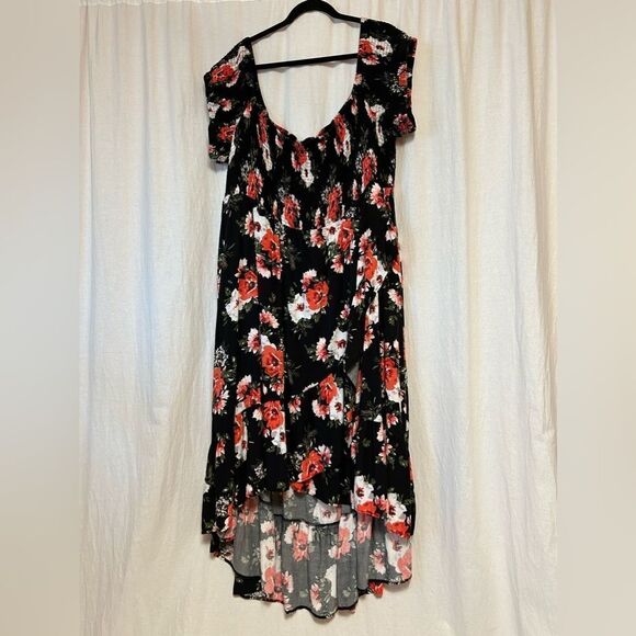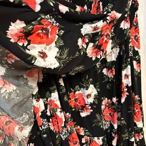 Torrid size 5 black with a red maroon colored roses. Elastic type top short sleeve fitted. Ruffled front hem.