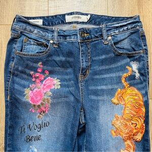 STYLE: girlfriend, tiger, flower, bird designs, distressed, tapered leg, 5-pocket, zipper and button closure, hand-painted, slight stretch, high waist