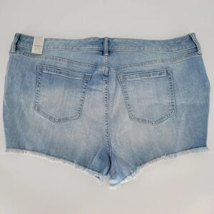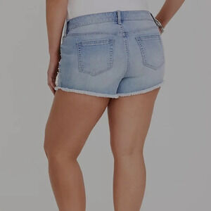 Torrid shorts vintage stretch light wash with pearls. Has distressing and raw edge