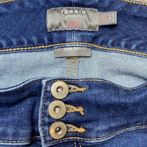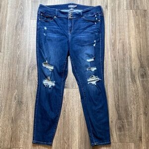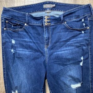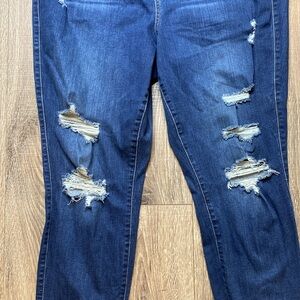 STYLE: super soft, zipper and three button closure, five pockets, very stretchy, high rise, distressed, busted knees