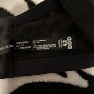 Sz 42DDD push-up plunge leopard print bra. There is NO padding in the cups but it’s still the push-up plunge style. Adjustable straps that can criss cross in the back. Hardly worn and in very good condition.