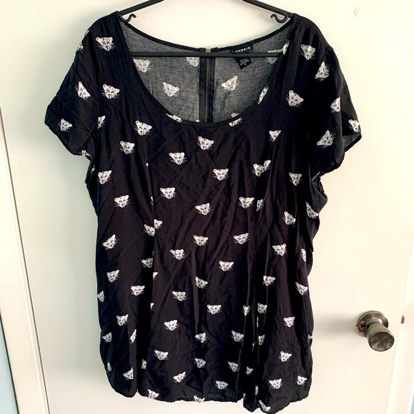 Black torrid top featuring white leopards! Zippered at the back of the neck, and loose at the bottom. Very cute, fun top
