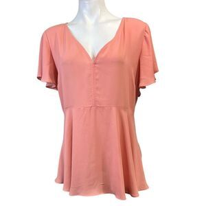 This charming pink blouse from Torrid features flutter sleeves and a flattering peplum silhouette, perfect for adding a touch of elegance to your outfit.