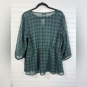 Torrid women’s black & green buffalo print sheer, peplum style blouse. Size 0. Keyhole neckline, 3/4 elastic cuff sleeves. Simply Beautiful!