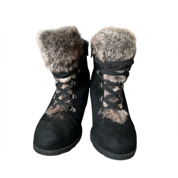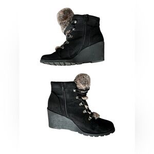 Torrid micro fiber upper with faux fur accent 3” wedge heels boots. Lace up in the front but zip up on the inside for easy off and on.
