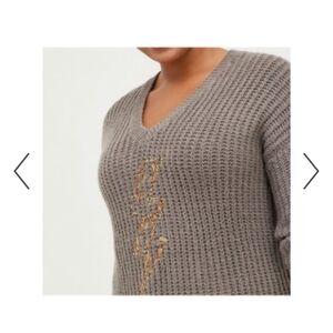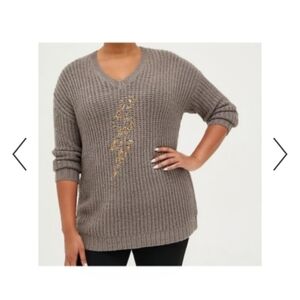 this is a torrid women's sweater size 2. it is gray with a gold lightning bolt. it is new without tag but still has the tag pull. it also has a v-neck and is very soft and comfortable