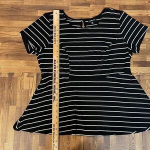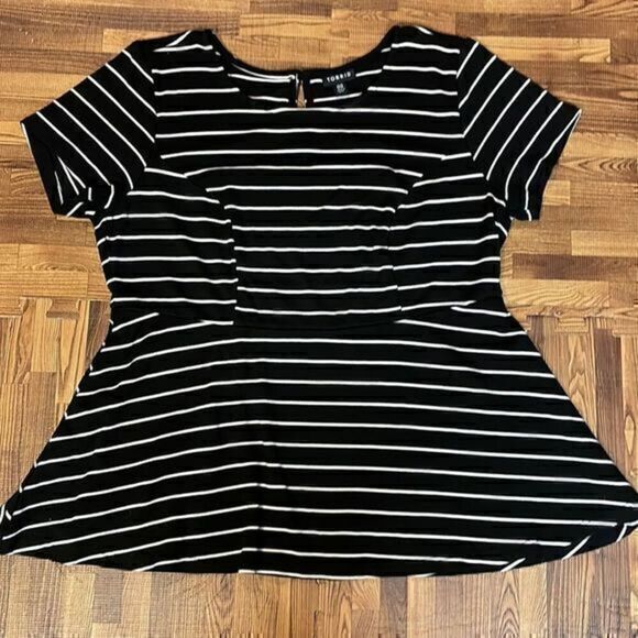 Torrid women’s short sleeve top. Great condition. No stains. No holes. No snags. Smoke-free home. Black with white stripes. 88% rayon 10% nylon 2% spandex. Very flattering on. Same day shipping Monday through Saturday. Open reasonable offers.