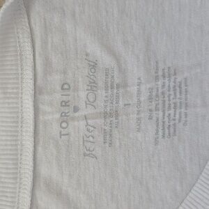 Torrid x Betsey Johnson iconic white graphic tee with black text. Size 1X. Worn twice. Very good pre-owned condition. No stains but there is some minor pilling under the arms and where I had the shirt tucked into a skirt. So cute with a skirt or jeans and a leather jacket and anything leopard print! This would be a keeper if it still fit.