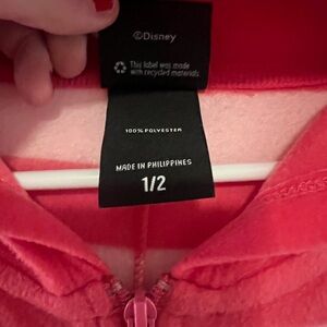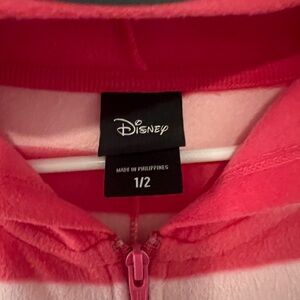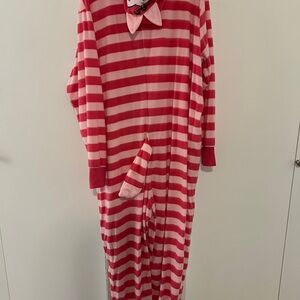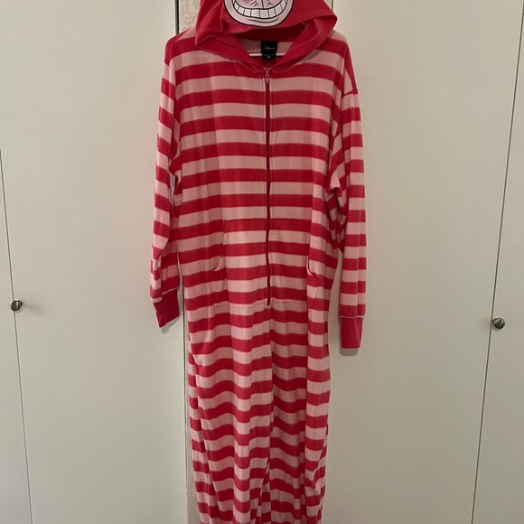 Cozy Torrid x Disney onesie with bold stripes. Features a fun hood. Ideal for bedtime comfort or cosplay! The Cheshire Cat face is on the hood and there’s a small tail on the backside. Pink and Hot Pink, full zipper, size 1/2.