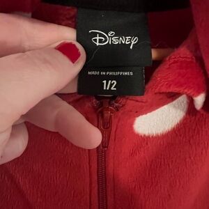Soft red onesie with white polka dots. Features a convenient zipper, and Minnie Mouse ears and bow on hood. Very soft and roomy. Great for getting cozy or for fun cosplay!