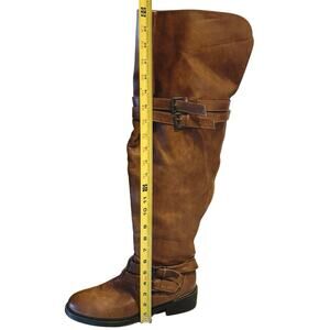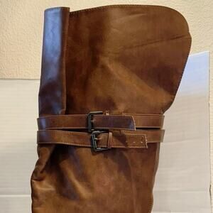 Torrid extra wide calf OTK over the knee boots, faux leather, waxed brown, double straps buckled, (can be folded down as well), these have a waxed distressed slouchy look with approx 1” heel, these top straps look like they’ve been cut and/or extra holes added on for the buckle bit, otherwise they are in near perfect condition with very little wear, there is an inside zipper and a stretch panel down the backside for ease of use and stretch, the mid calf is 20” circumference and the top is nearly 24” around (12” across laying flat) they are 2 feet tall from the bottom, RARE and incredibly hard to find, Torrid size 11 extra wide boots.