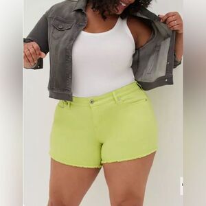 Vibrant yellow jean shorts by Torrid. Features button fly and frayed hem and side slits. Ideal for casual outings.