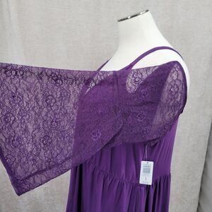 Stylish purple top with cold shoulder design and lace sleeves. Perfect for a chic look.