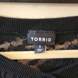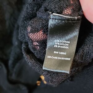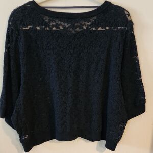Elegant black lace cardigan. Features button-up front. Perfect for layering.