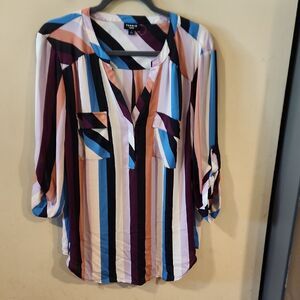 This Torrid blouse features a classic black and white color scheme with a relaxed fit and buttoned style. The lightweight fabric and flowing design make it perfect for casual or business casual settings. New condition