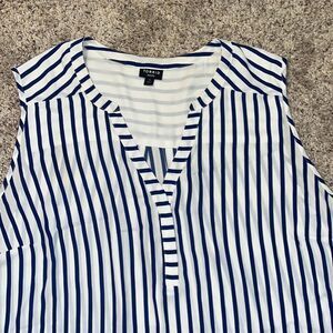 This top is made by Torrid. It’s a blue and white sleeveless Harper blouse. Torrid size 4 (4X) and in wonderful pre owned condition. Smoke and pet free home. Stock photo to show fit.