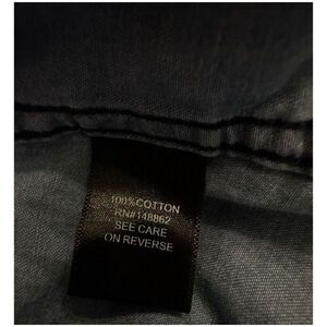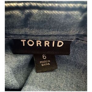 Torrid denim button down with one button missing (see pix). Bust 68”, sleeve 26” and length 33”.