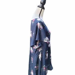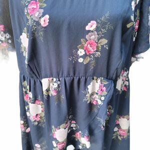 Floral, short sleeved tunic with a ruffled high low hem and a cross over in the front. It's cinched at the waist. In excellent used condition. Size 2X.