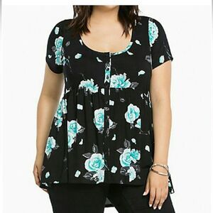 Breaking news; this top has everything; the black knit is stretchy and soft, the turquoise floral print is feminine and eye-catching, the button front lends a hint of polish to the short sleeves, and the hi-lo hem lets you relax.