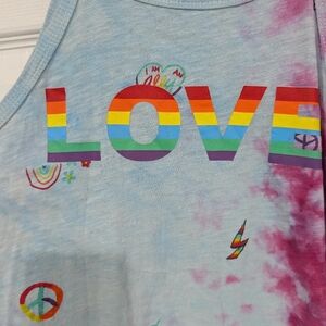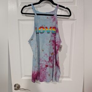Vibrant tank top with 'LOVE' graphic and rainbow colors. Features a mix of blue and purple tie-dye.