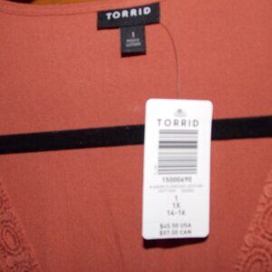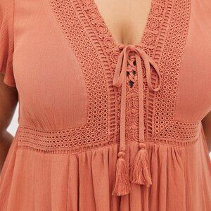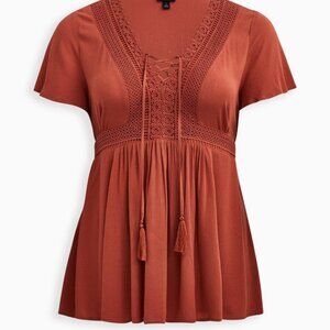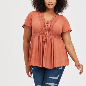 Torrid-NWT Babydoll Crinkle Gauze Crochet Inset Lace-Up Top