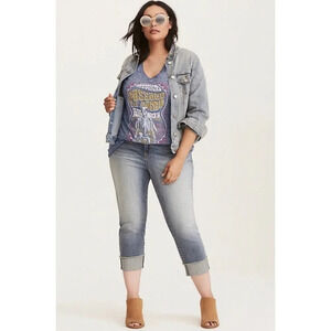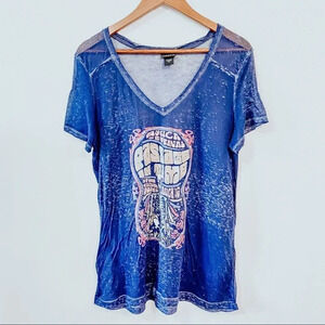 Torrid Passage In Time Graphic Burnout Tee. Navy blue burn out. Short sleeve. V-neck. Skeleton graphic. Slight peeling. 47% Polyester 45% Cotton 8% Rayon. Torrid size 00 which converts to a women’s size medium - approximate measurements below.