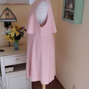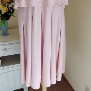 This pretty dress is perfect for work or a special event. Soft Knit, medium weight. The bodice has a princess seamed layer that is loose and flattering. The skirt is attached to the bodice lining. It has stitched down pleats. Back zip. Size 48 at chest, 40at waist, 60 at hips. 40 long from shoulder to hem. This soft knit is comfortable and flattering. You will love it!
