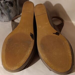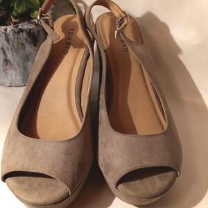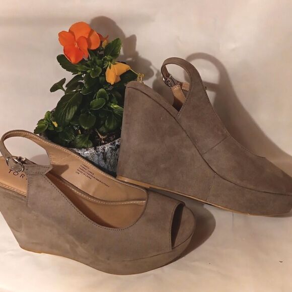 Warm taupe platform wedges.Faux suede. Open toe. Sling back. 1.25 inch platform, 5.5 inch overall height. Excellent condition. Size 10W measures 11 long, 3.75 wide. Comfortable and very high.