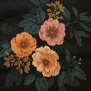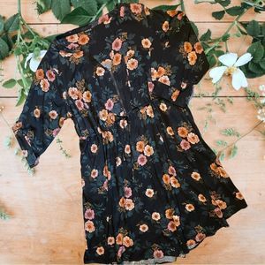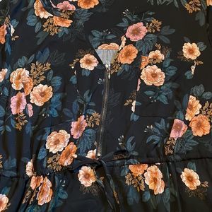 Torrid. Rich dark background with peach and blush floral print. Cinch waist