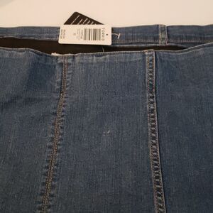 ~ Description: Medium blue wash denim skirt, side zipper closure, stretchy