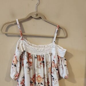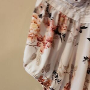 This Torrid blouse features a charming smocked and ruffled design, complemented by its short sleeves and soft white and cream hues. The light, flowy fabric ensures a comfortable fit, making it a versatile addition to any wardrobe.