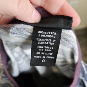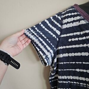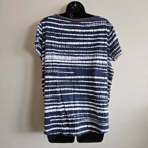This is a short sleeved t-shirt by Torrid. It has blue and white tie dye style stripes and a purple accented v-neckline. Note the back of this top is longer than the front.