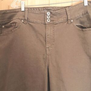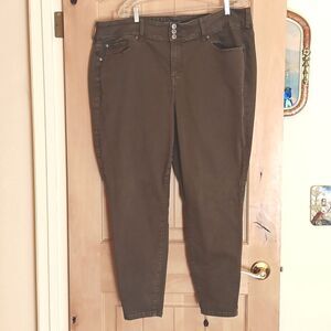 Olive green. My pictures look brown, but these are olive green. Torrid jeans . Five pocket. Three buttons at fly front. Signature hardware. Wider waistband. Size 24T measures 44 at waist, 48 at hips, 13.5 inch rise. 28-inch inseam, 12 inch opening at hem. Classic and super soft.
