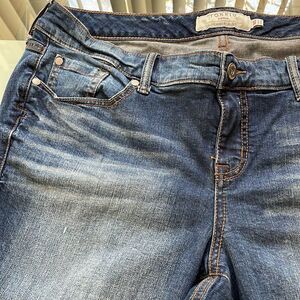 Torrid denim we swear by the fit 16s dark blue wash very stretchy laying flat approximately 38 waist 23 inseam 9.5 rise few discoloration specs on front see pictures