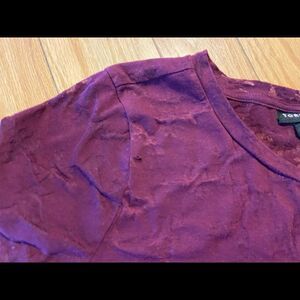 Torrid maroon/purple leaf pattern short sleeve top. One small hole near right shoulder (shown). Some light pilling. Armpit to armpit 19 1/2 inches. Length 27 inches. 54% cotton, 46% polyester. Size 0.