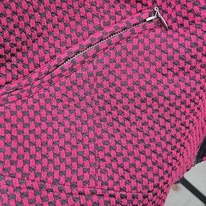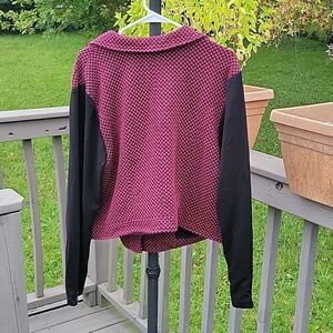 Partial zip closure on the front, two zip pockets, zippers on the sleeves.