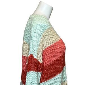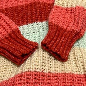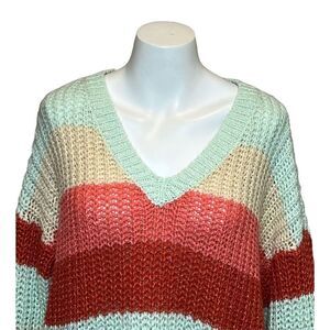 Torrid multi striped V-neck pull over oversized sweater size 1X. Style 16526205. Chunky knit. Lime green, cream, coral, burnt orange. Very good condition. 60% acrylic 24% polyester 16% nylon. Length 26” Chest 24”.