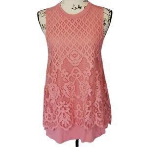 This beautiful tank is a pink higher neck with peek a boo back it's a 00 (the equivalent to a medium) in excellent condition no damage at all the lace overlay is gorgeous pair with skinny jeans for a great day out or dress it