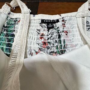 Torrid white floral print polyester summer dress front v neck, thin spaghetti straps, elastic touched back, crochet accents