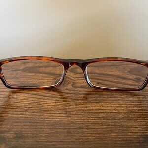 These tortoise eyeglass frames are in good pre-owned condition with normal signs of wear from previous use. The full rim rectangular frame is sturdy and the hinges function well. There are some minor surface scratches consistent with light use, but nothing that affects durability or overall appearance. Overall, these frames are a stylish and practical choice for everyday eyewear. Stylish full-rim eyeglass frames in a classic tortoise pattern. These rectangular glasses are lightweight and durable, making them suitable for everyday wear. Great for women looking for fashionable eyewear. These eyeglass frames are versatile and can be fitted with new lenses. Perfect for fashion, casual wear, or as a backup pair of frames.