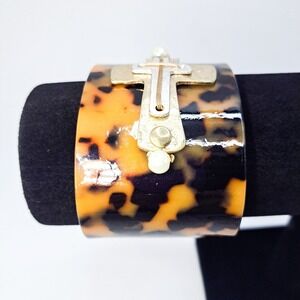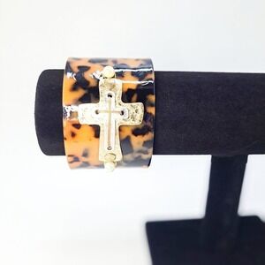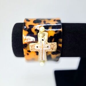 Tortoise Shell Cuff Bracelet Wide Gold Cross Pearl Accent Statement Religious