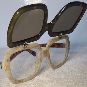 Unique and Stylish tortoise shell square sunglasses perfect for any occasion. These sunglasses feature a blend of brown and cream colors, offering a chic and modern look. Hinged glasses flip from shaded to clear lenses. Perfect for switching between various lighting conditions. Say goodbye to taking your shades off when inside and forgetting them somewhere. Definitely a statement and conversation starter.
