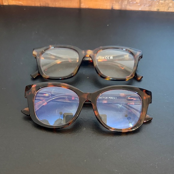 Stylish tortoise shell square glasses. Includes two pairs. +2.00 and +1.25 magnification