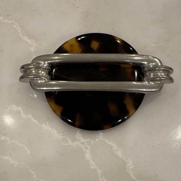 Stylish tortoise shell pin with silver accents. Perfect for adding elegance to any outfit.