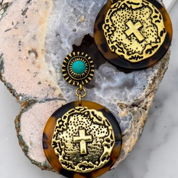 Boho turquoise stud and cross on tortoise disc drop earrings. Approximate measurements: 1.25"X2.0"