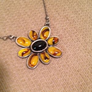 Tortoise shell costume jewelry with flower shaped pendant anchored in two points. Pendant measures 1.5 inches across and 1.5 inches tall; lays flat and is only approx .25 inches deep. Dark silver colored chain. Necklace can expand to about 17 inches. Other measurements are otherwise pictured. Necklace closes with a lobster claw fastening and adjustable linked chain.