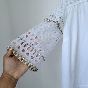 White Cutout Tunic Top With Gold Embellishments By Tory Burch