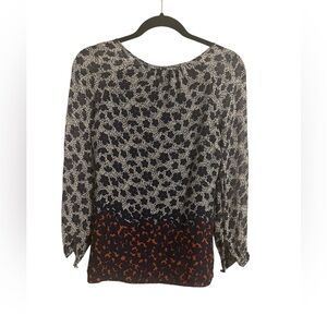 Stylish women's top featuring a navy and orange pattern. Perfect for casual outings or a day at the office.