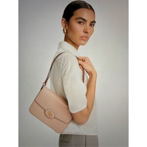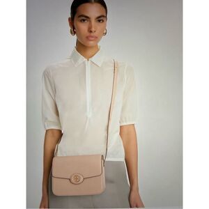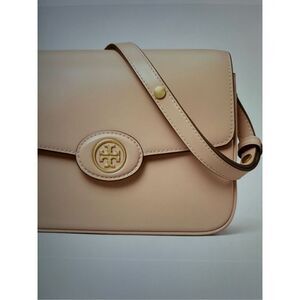 Tory Bruch Robinson Spazzolato Convertible Bag. Patent Leather. Brass hardware. Flap with a magnetic snap closure. Adjustable shoulder strap with 9.8” drop. One interior slit pocket. Dust bag included. Dimensions: 6.1”x 8.3x2.4”. Color is Blush.