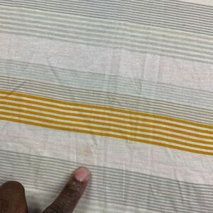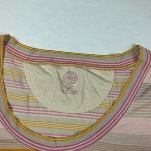 Description:Tory Burch striped tee with front logo. Preppy, casual vibe in peach, pink, and mustard tones. Soft cotton with classic fit and light feel. Note: small blemish on front.
